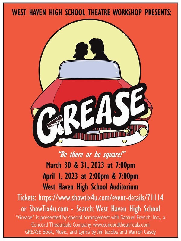 The West Haven High School Theatre Workshop will perform four shows of "Grease" on March 30th and 31st at 7 pm, and on April 1st at 2 pm and 7 pm. The event will take place in the West Haven High School Auditorium.