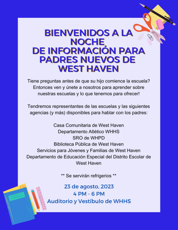 Nuevos padres, ¡bienvenidos a West Haven! Consulte el folleto a continuación sobre un evento importante antes del comienzo de la escuela.