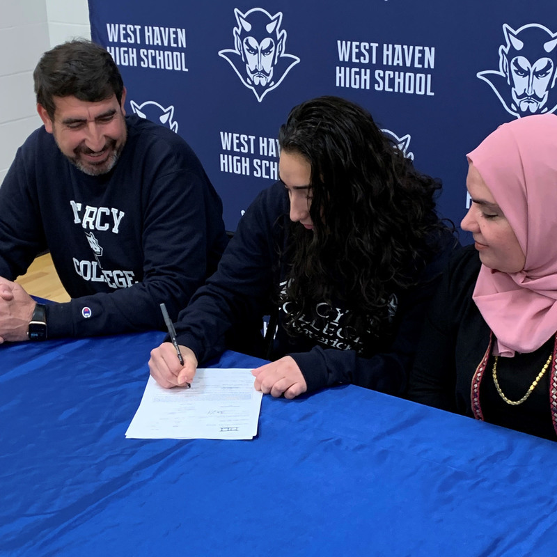 Amani Abuhatab, a senior on the West Haven High School girls basketball team, signed her National Letter of Intent (NLI) Wednesday to play college basketball at Mercy College. Amani put the pen to paper on the first day of National Signing Day with her parents by her side, and WHHS coaches, teammates, and administrators in attendance.